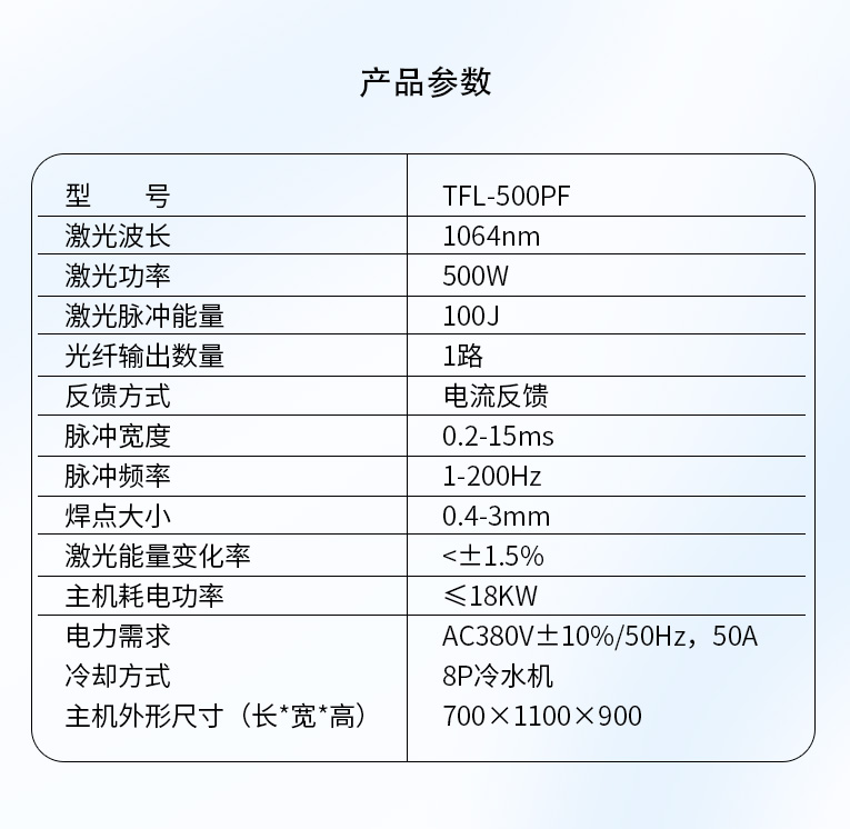 通發激光TFL-500PF光纖激光焊接機,激光功率大,經過光纖優化獲得卓越的光束質量,滿足1.5mm以內料厚,熔深1mm以內的廚衛,家電,高速不銹鋼激光焊接加工。